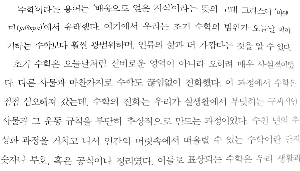 수학이란? ‘배움으로 얻은 지식’이라는 뜻의 고대 그리스어 ‘마테마’에서 유래. 오늘날 이야기하는 수학보다 훨씬 광범위하며, 인류의 삶과 더 가깝다는 것을 알 수 있다(수학은 삶의 지혜다?)