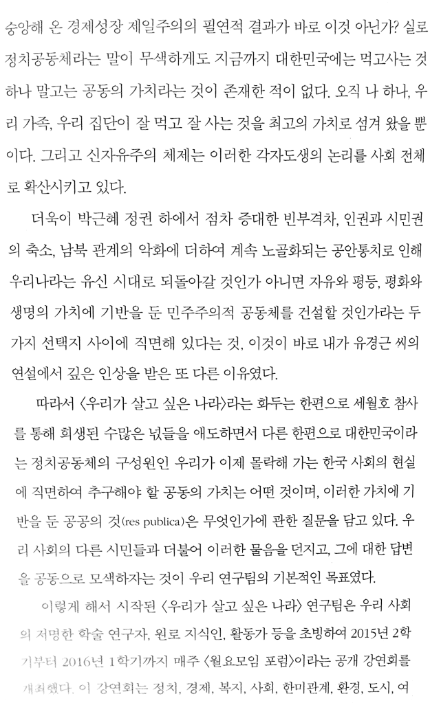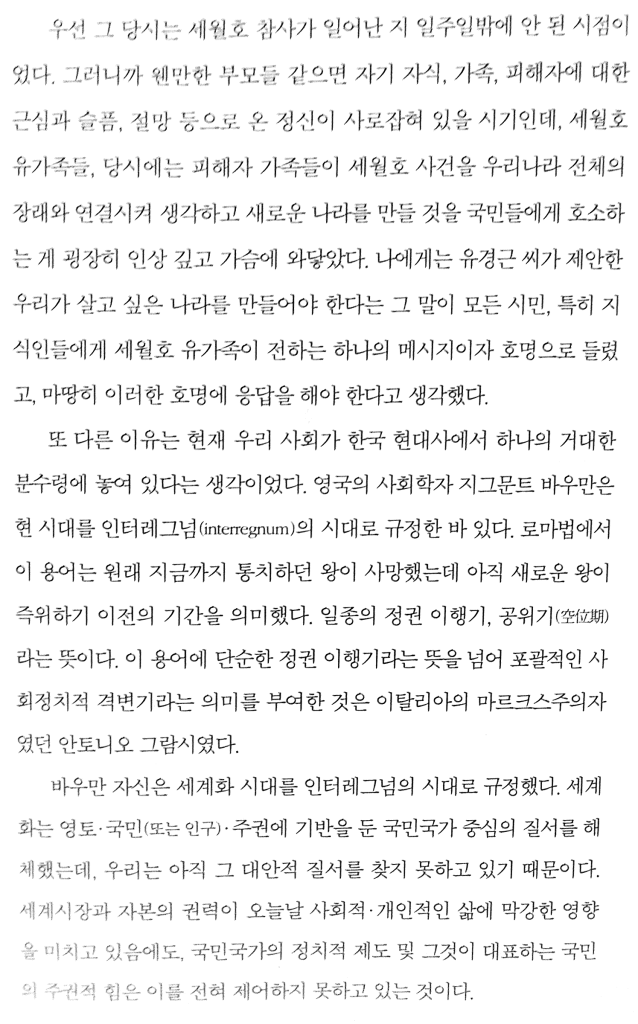 세월호 침몰 1주일 후 집회. 예은 아빠, 유경근 씨의 연설…웬만한 부모들 같으면 자기 자식, 피해자에 대한 근심과 슬픔, 절망 등으로 온 정신이 사로잡혀 있을 시기인데, 세월호 유가족들, 당시에는 피해자 가족들이 세월호 사건을 우리나라 전체의 장래와 연결시켜 생각하고 새로운 나라를 만들 것을 국민들에게 호소하는 게 굉장히 인상 깊고 가슴에 와닿았다. 나에게는 유경근 씨가 제안한 우리가 살고 싶은 나라를 만들어야 한다는 그 말이 모든 시민, 특히 지식인들에게 세월호 유가족이 전하는 하나의 메시지이자 호명으로 들렸고, 마땅히 이러한 호명에 응답을 해야 한다고 생각했다.