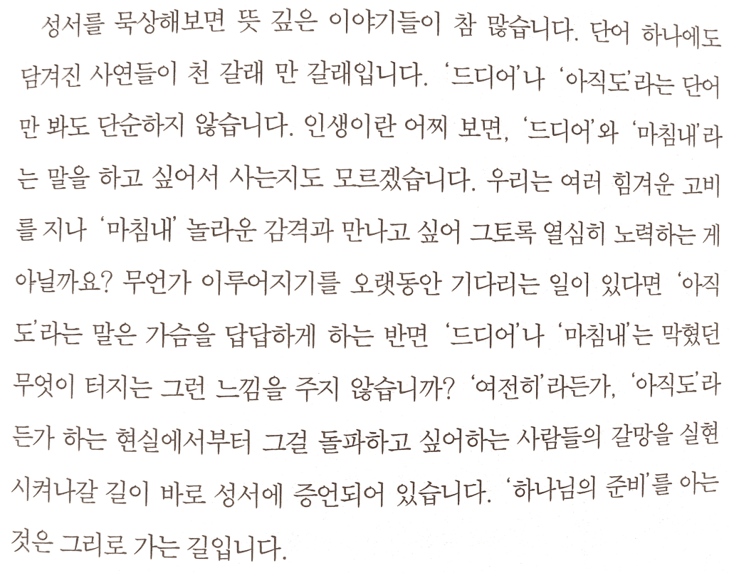 성서는 적나라한 책입니다…여기서 ‘적나라하다’는 것은 인간의 문제를 고스란히 비추고 있다는 것을 말합니다. 인간에 대해 빼고 더하고, 미화하거나 왜곡하지 않습니다. 아무리 뛰어난 인간도 성서에는 그 모순이 정직하게 드러납니다. 거기서 우리는 자신의 모습을 숨김없이 발견하고 스스로 솔직해져갑니다.