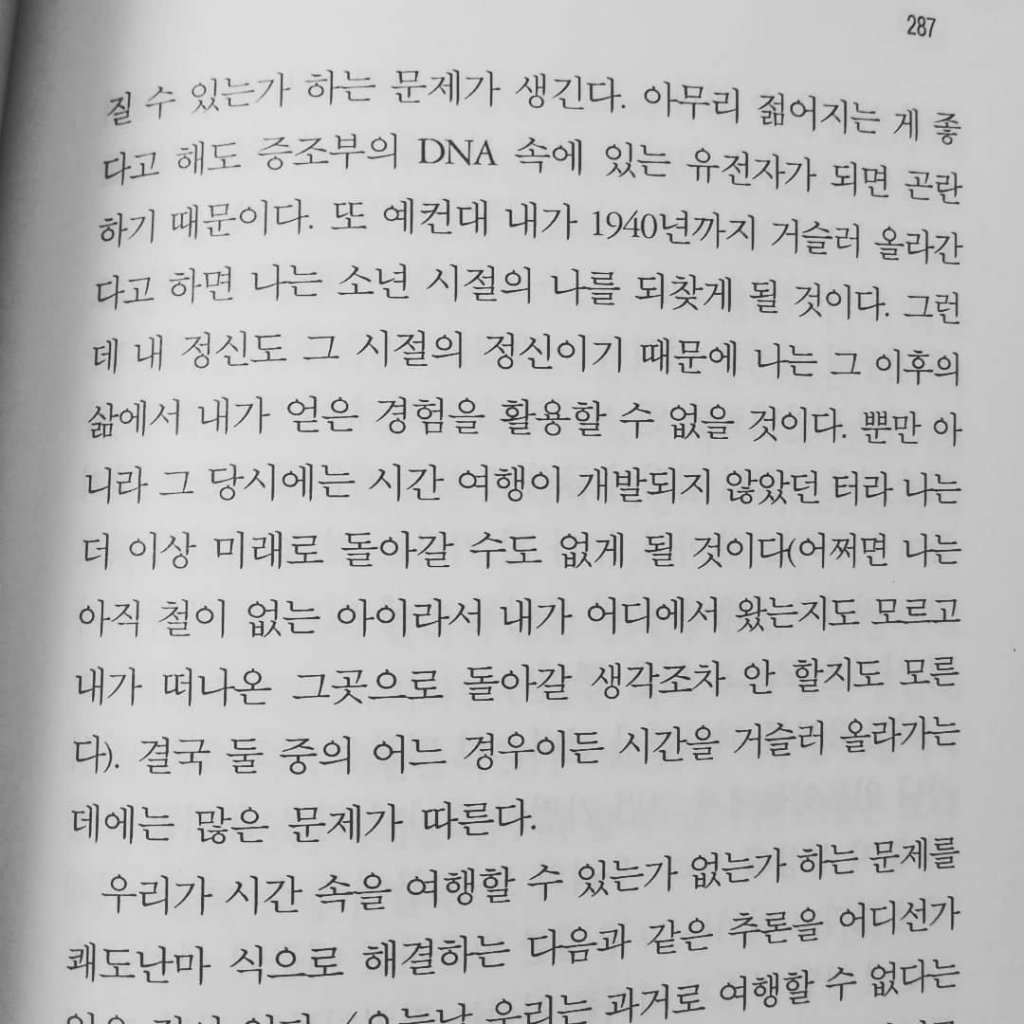 나는 그 분야에 문외한이라서 그런 주장에 대해 가타부타할 생각은 없다. 하지만 나는 비록 전문 지식은 없어도 이러저러한 책들에서 읽은 것이 있어서 그랬는지 그런 주장에 별로 놀라지 않았다…..그런데 시간을 거슬러 올라가는 여행을 할 때 우리의 나이는 어떻게 되는 걸까?