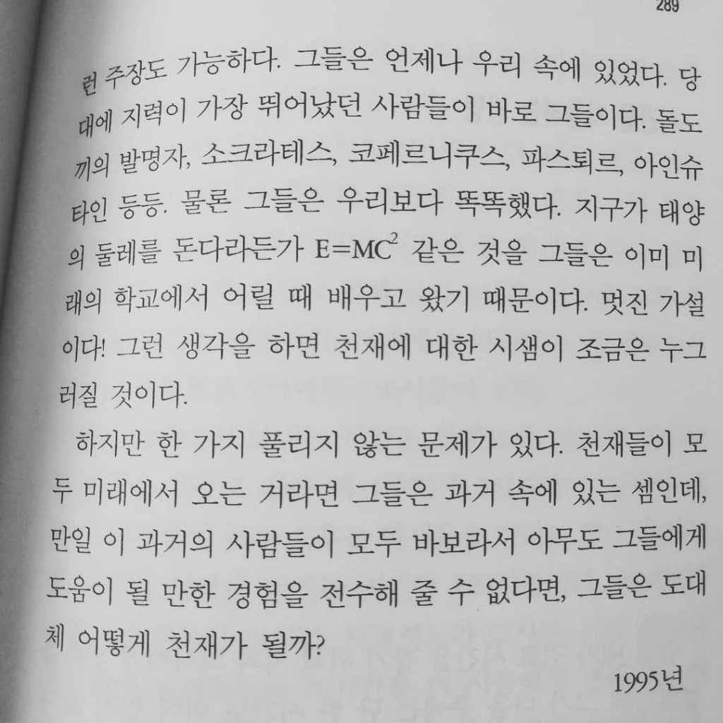 한 가지 풀리지 않는 문제가 있다. 천재들이 모두 미래에서 오는 거라면 그들은 과거 속에 있는 셈인데, 만일 이 과거의 사람들이 모두 바보라서 아무도 그들에게 도움이 될 만한 경험을 전수해 줄 수 없다면, 그들은 어떻게 천재가 될까?