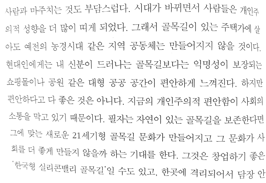 과거 우리의 삶을 돌아보면 집은 무척 작았다. 하지만 대신 마당이나 골목길 같은 도시의 외부 공간을 사적으로 사용하거나 가까운 이웃들과 함께 공유하며 여유롭게 살았다.