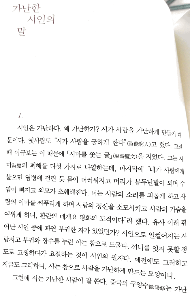 시는 음풍농월이다. “…음풍농월하면서 꽃을 찾고 버들을 따르는 일은 천욕이다. 천욕은 없어서는 아니 되니 없으면 삭막하고, 인욕은 있어서는 아니 되니 있으면 더러워진다” 라고 했다.