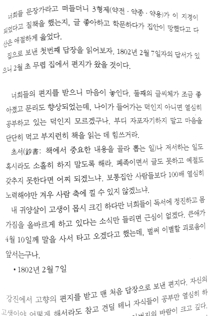유배지에서 보낸 편지 글 좋아하고 학문하다가 집안이 망했다…내 귀양살이 고생이 몹시 크긴 하다만 너희들이 독서에 정진하고 몸가짐을 올바르게 하고 있다는 소식만 들리면 근심이 없겠다.