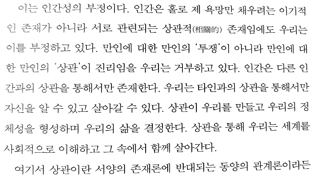 합리주의는 고립적인 개인의 불굴의 의지를 가지고 혼자서 해결하는 것을 최고의 가치로 친다. 반면 상관주의는 자신의 약점을 포함하여 자신의 모든 허술한 면을 상대방에게 솔직하게 드러내어 함께 니누고 고치는 용기를 강조한다. 이는 당연히 상대방에 대한 믿음을 전제로 한다. 서로를 믿지 못하면 누구도 자유로울 수 없다…그러한 상관적 자유의 표상이 간디의 비폭력저항이다.
