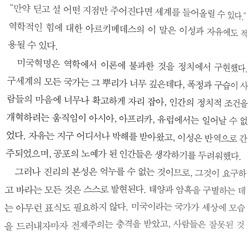 나는 『상식』과 『인권』에서 페인이 말한 것보다 더 명쾌한 민주주의와 헌법에 대한 이야기를 읽은 적이 없다.