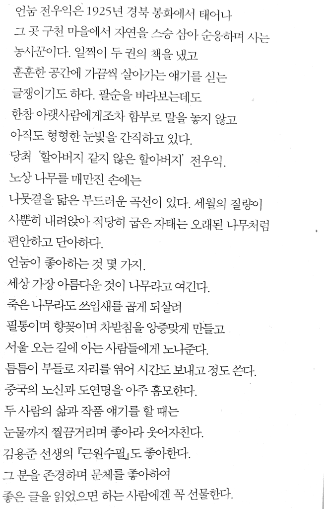 삶의 제자리를 온전히 지키고 나무 같은 삶을 살다간 ‘진정한 노인’ 전우식 선생님의 말씀들. 이미 한참을 지난 말씀들이지만 지금 찬찬히 새겨들어봐도 귀에 쏙쏙 들어옵니다.