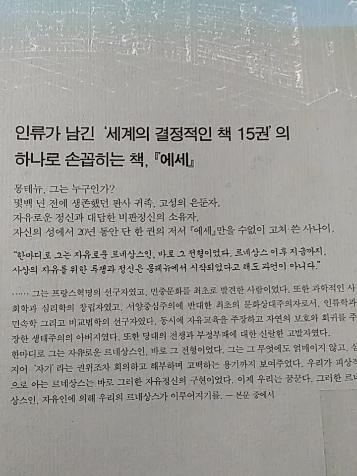 「에세」는 명확하고 테두리가 분명한 기승전결의 논리를 요구하거나 매사에 결론을 요구하는 사람에게는 잡다하고 통일성이 없어 보인다. 그러나 그것이 바로 몽테뉴 사상의 특징인 다양성과 유연성이 아니겠는가.