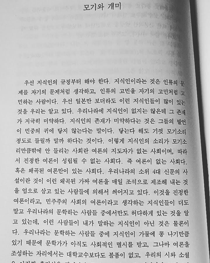 우선 지식인의 규정부터 해야 한다. 지식인이라는 것은 인류의 문제를 자기의 문제처럼 생각하고, 인류의 고민을 자기의 고민처럼 고민하는 사람이다…우리나라에 지식인이 없지는 않은데 그 존재가 지극히 미미하다. 지식인의 존재가 미미하다는 것은 그들의 발언이 민중의 귀에 닿지 않는 다는 말이다. 닿는다 해도 기껏 모기소리 정도로 들릴까 말까 하다는 것이다. 이렇게 지식인의 소리가 모기소리만큼밖에 안 들리는 사회란 여론의 지도자가 없는 사회이며, 따라서 진정한 여론이 성립될 수 없는 사회다. 즉 여론이 없는 사회다. 혹은 왜곡된 여론만이 있는 사회다. 우리나라의 소위 4대 신문의 사설이란 것이 이런 왜곡된 가짜 여론을 매일 조석으로 제조해 내는 것을 업으로 삼고 있는 사람들에 의해 씌어지고 있다.