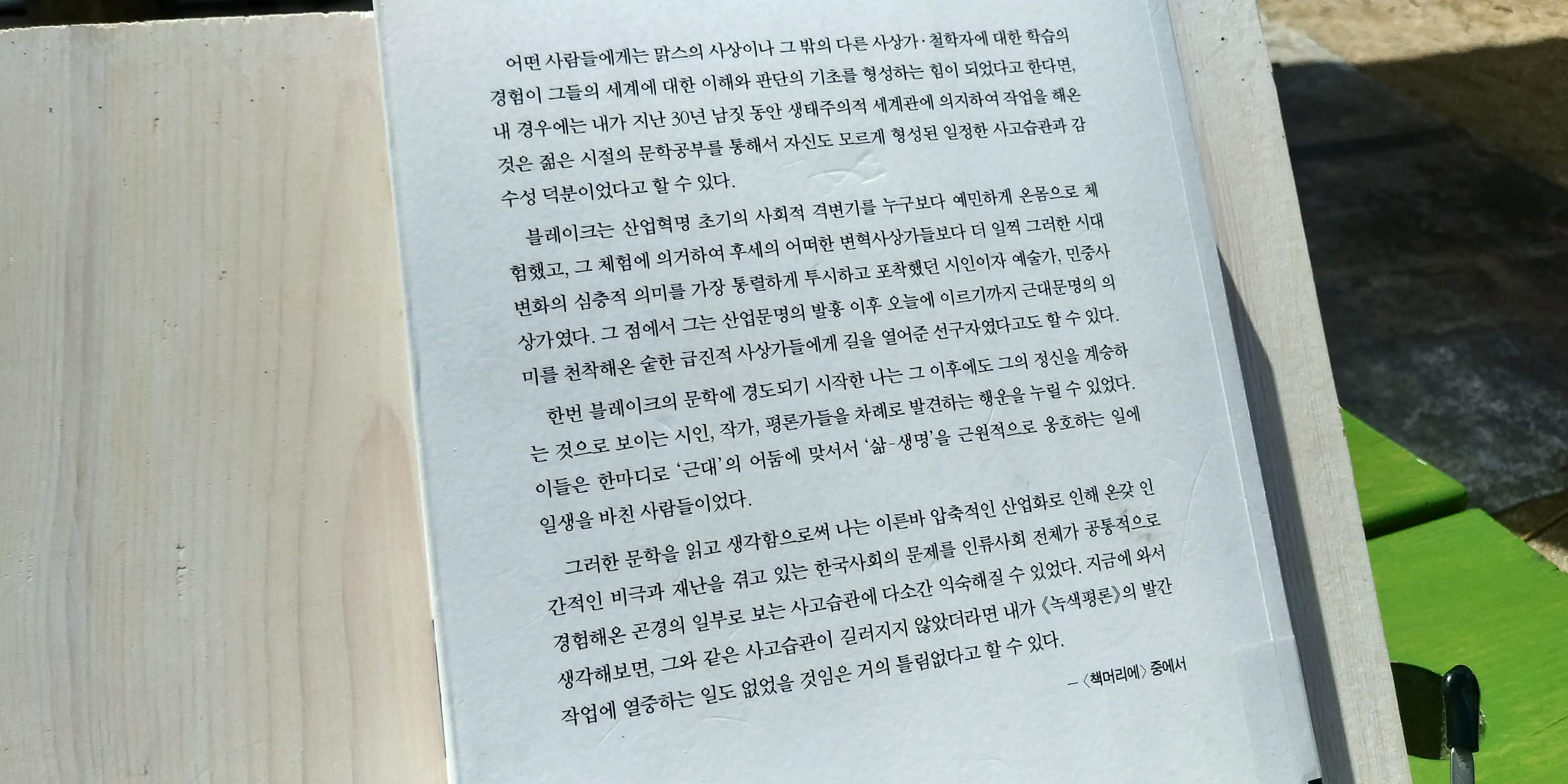 어떤 사람들에게는 맑스의 사상이나 그 밖의 다른 사상가•철학자에 대한 학습의 경험이 그들의 세계에 대한 이해와 판단의 기초를 형성하는 힘이 되었다고 한다면, 내 경우에는 내가 지난 30년 남짓 동안 생태주의적 세계관에 의지하여 작업을 해온 것은 단지 미국의 대학 도서관에서의 독서경험만이 아니라 그 이전에 열중했던 문학공부를 통해서 자신도 모르게 형성된 일정한 사고습관과 감수성 덕분이었다고 할 수 있다.