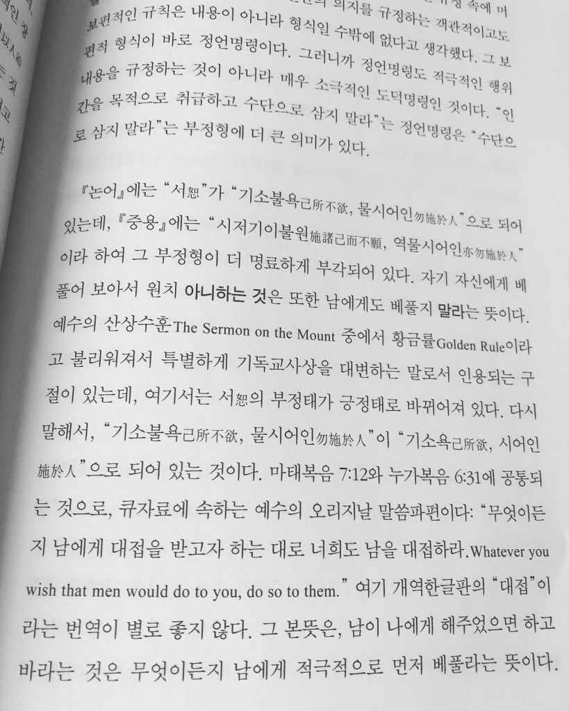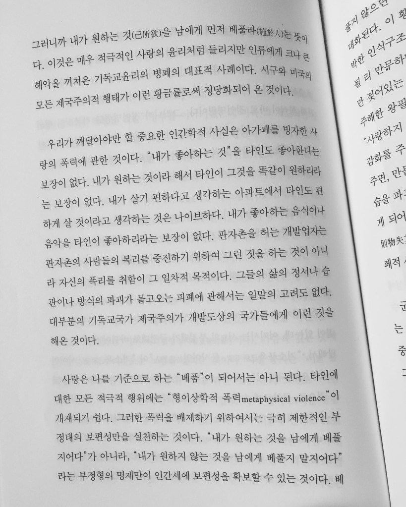 내가 원하는 것을 남에게 먼저 배풀라..이것은 매우 적극적인 사랑의 윤리처럼 들이지만 인류에게 크나큰 해악을 끼쳐온 기독교윤리의 병폐의 대표적 사례이다. 서구와 모든 제국주의적 행태가 이런 황금률로써 정당화되어 온 것이다.