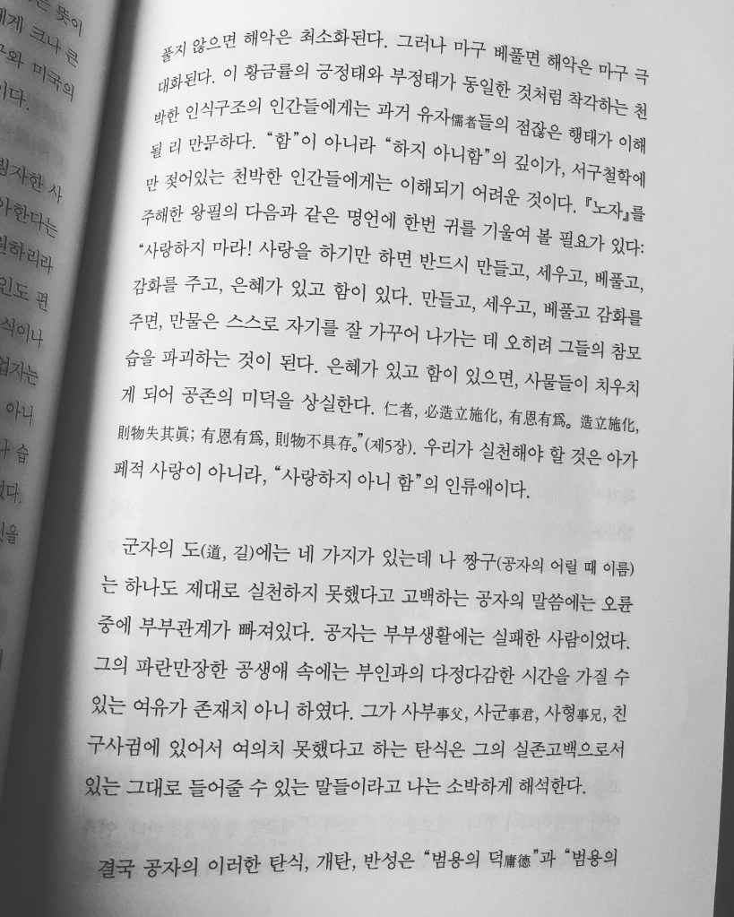 “내가 원하는 것을 남에게 베풀지어다”가 아니라, “내가 원하지 않는 것을 남에게 베풀지 말지어다”라는 부정형의 명제만이 인간세에 보편성을 확보할 수 있는 것이다. 베풀지 않으면 해악은 최소화된다. 그러나 마구 베풀면 해악은 마구 극대화된다. 이 황금률의 긍정태와 부정태가 동일한 것처럼 착각하는 천박한 인식구조의 인간들에게는 과거 유자들의 점잖은 행태가 이해될 리 만무하다. “함”이 아니라 “하지 아니함”의 깊이가, 서구철학에만 젖어있는 천박한 인간들에게는 이해되기 어려운 것이다.