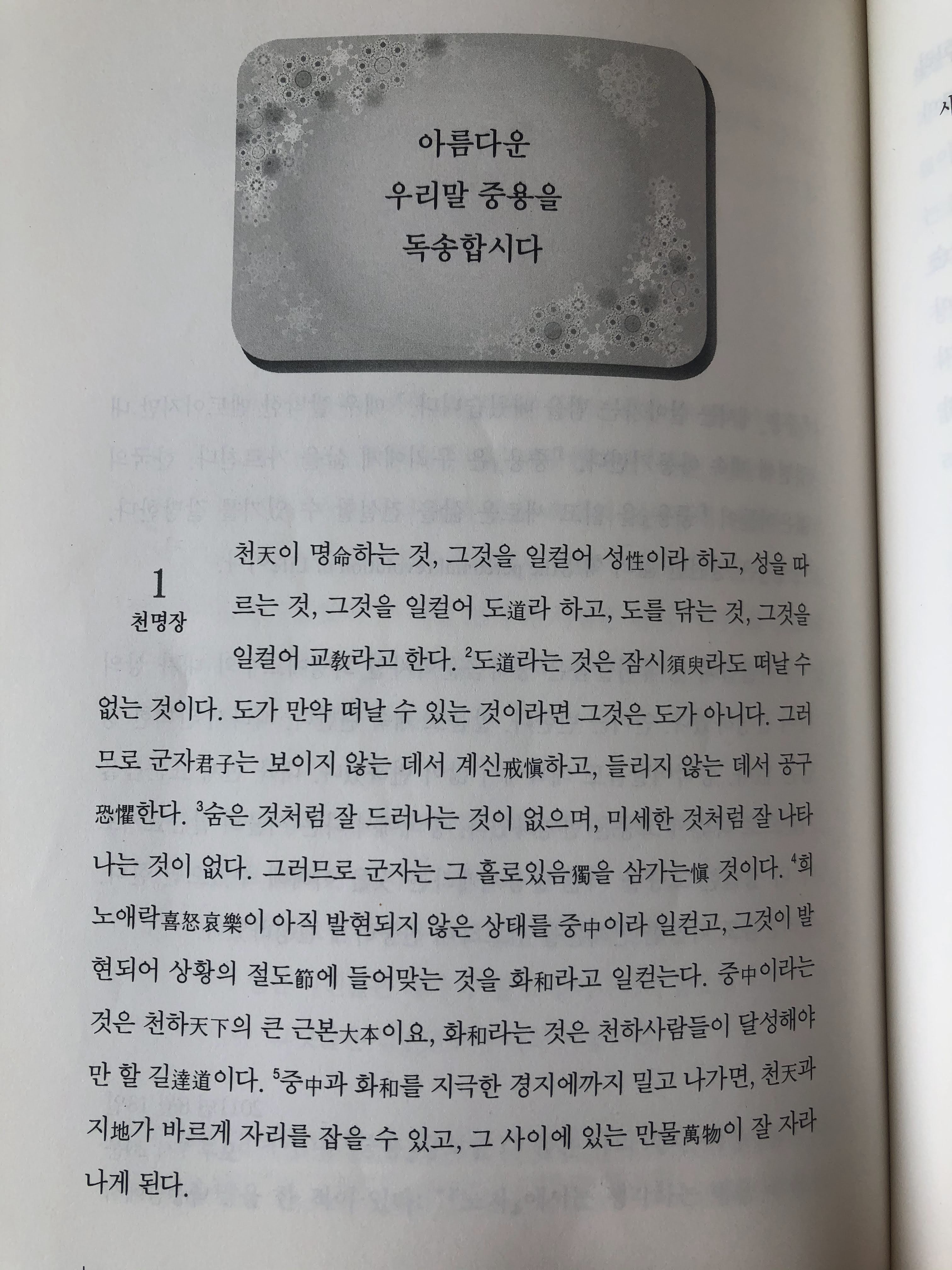 희노애락이 아직 발현되지 않은 상태를 중中 이라 일컫고, 그것이 발현되어 상황의 절도에 들어맞는 것을 화和라고 일컫는다. 중이라는 것은 천하의 큰 근본이요, 화라는 것은 천하사람들이 달성해야만 할 길이다.