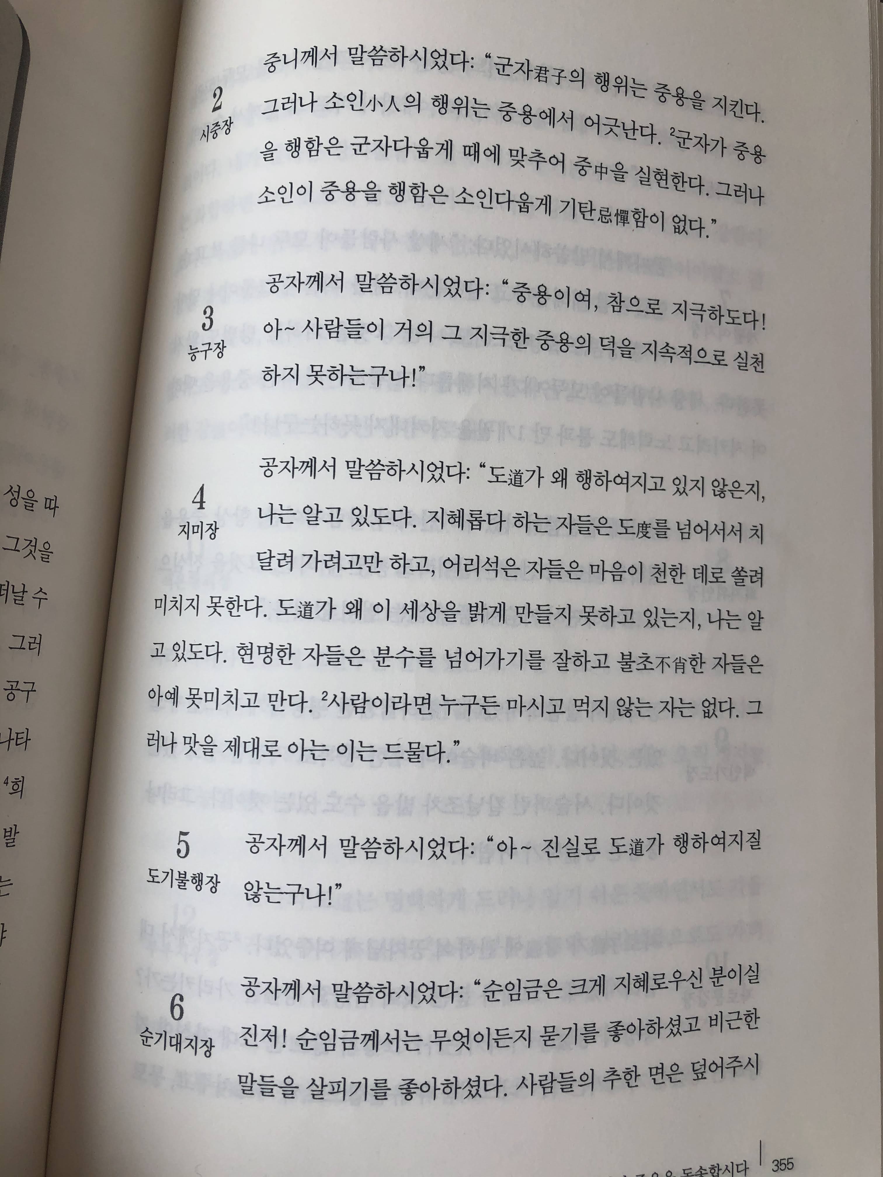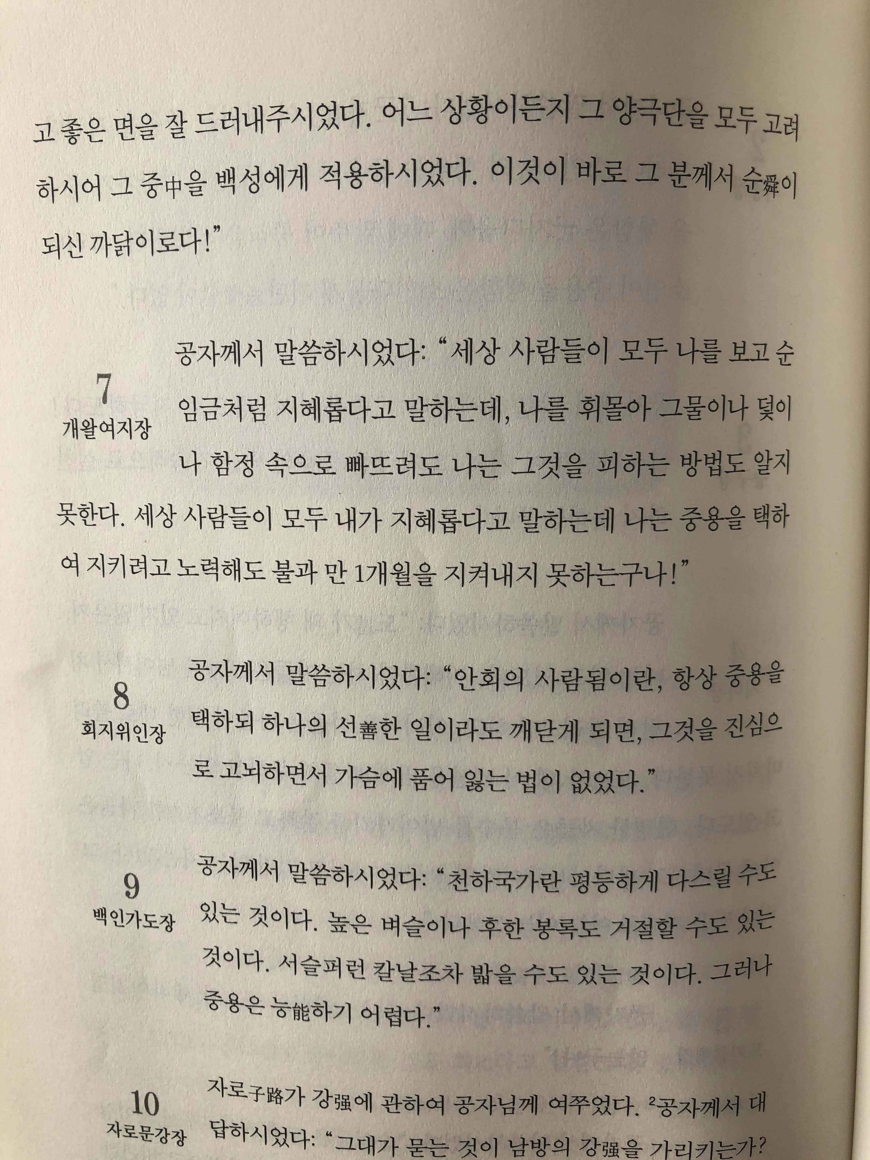 “순임금은 크게 지혜로운신 분이실진저! 순임금께서는 무엇이든지 묻기를 좋아하셨고 비근한 말들을 살피기를 좋아하셨다. 사람들의 추한 면은 덮어주시고 좋은 면을 잘 드러내주시었다. 어느 상황이든지 그 양극단을 모두 고려하시어 그 중中을 백성에게 적용하시었다. 이것이 바로 그 분꼐서 순舜이 된신 까닭이로다!”