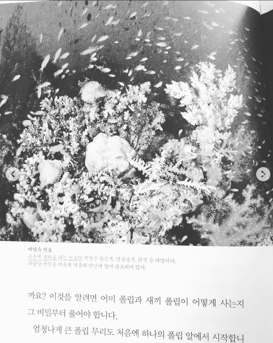 이렇게 공동체를 이루며 사니 죽음이 있을 리 없습니다. 본디 폴립 하나하나는 늙어 죽기도 합니다. 모든 동물은 언젠가는 죽게 마련이고 폴립 또한 동물이니까요. 하지만 죽기 전에 수많은 새끼를 만들고 그 새끼가 자라나 또 수많은 새끼를 만들기 때문에 산호 공동체가 무너지는 일은 좀처럼 일어나지 않습니다.