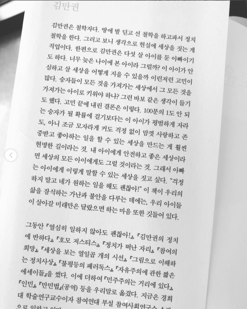 100분의 1도 안 되는 승자가 될 확률에 걸기보다는 이 아이가 평범하게 자라도, 아니 조금 모자라게 커도 걱정 없이 맘껏 사랑하고 존중받고 좋아하는 일을 할 수 있는 세상을 만드는 게 훨씬 현명한 길이라는 것. 내 아이에게 안전하고 좋은 세상이라면 세상의 모든 아이에게도 그럴 것이라는 것. 그래서 아빠는 아이에게 이렇게 말할 수 있는 세상을 짓고 싶다. “걱정하지 말고 네가 원하는 일을 해도 괜찮아!” #땅에발딛고선철학