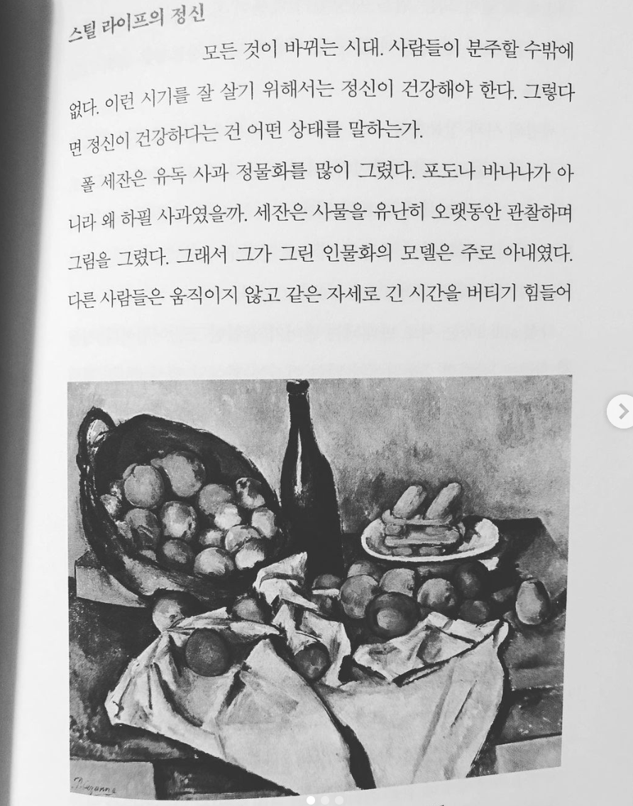 스틸 라이프의 정신. 모든 것이 바뀌는 시대. 사람들이 분주할 수밖에 없다. 이런 시기를 잘 살기 위해서는 정신이 건강해야 한다. 그렇다면 정신이 건강하다는 건 어떤 상태를 말하는가…현대 철학을 열었다고 평가받는 니체는 이렇게 말한 바 있다. “우리 문명은 야만 상태로 치닫고 있다. 부산한 자가 이렇게 높게 평가받은 시대는 없었다.” 지금은 더 그렇다…분주한 시절, 세상을 고요하게 바라보는 건강한 정신이 삶을 살린다는 점을 세잔의 사과 정물에서 볼 수 있다. #정물화 #stillLife #폴세잔 #건강한정신