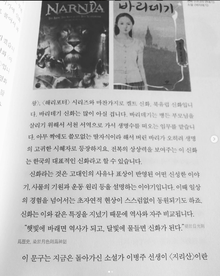 신화와 현실은 어떤 관계를 맺고 있나요? 신화라는 것은 한 공동체를 결속시키고 개개인에게 내면화되어서 그 사람의 행동규범이 되고 행동양식으로 발현됩니다…저는 아주 뒤늦게야 마하바라타를 읽었습니다. 그리스 로마 신화만 읽고 세상의 모든 신화를 다 아는 듯 하고 있다가, 이 훌륭한 신화를 너무 늦게 접한 것이죠…그래서 저는 이렇게 얘기하고 싶습니다. 세상에는 두 종류의 사람이 있다. 라마야나와 마하바라타를 읽은 사람과 그렇지 않은 사람. 저는 당연히 여러분들에게 읽은 사람이 되라고 권하고 싶습니다. #고전읽기