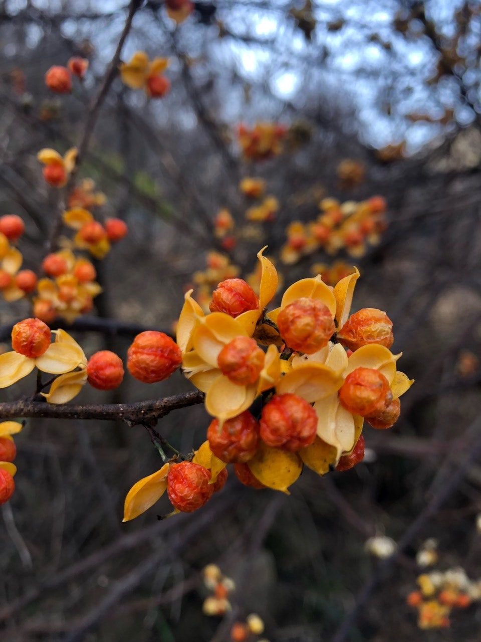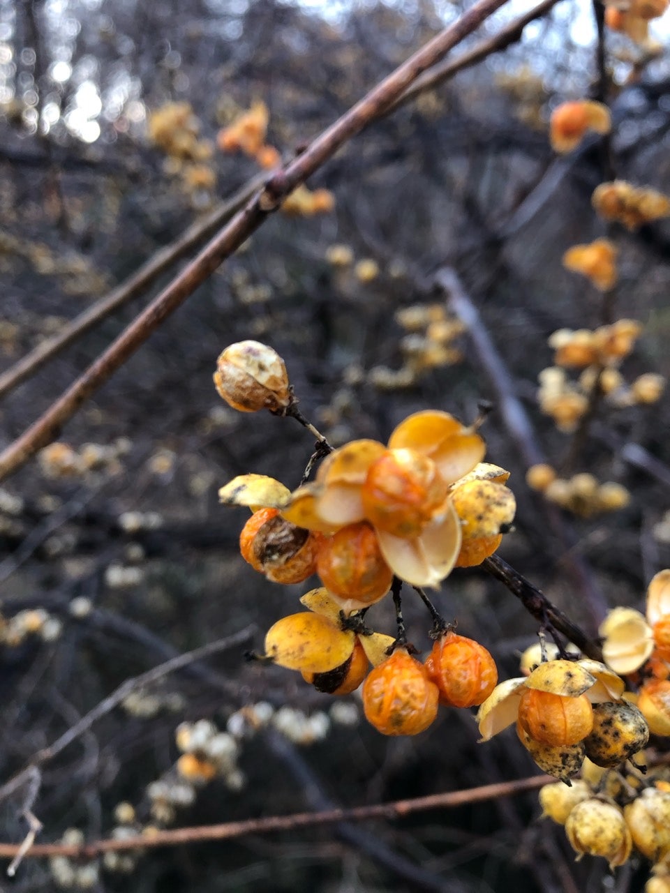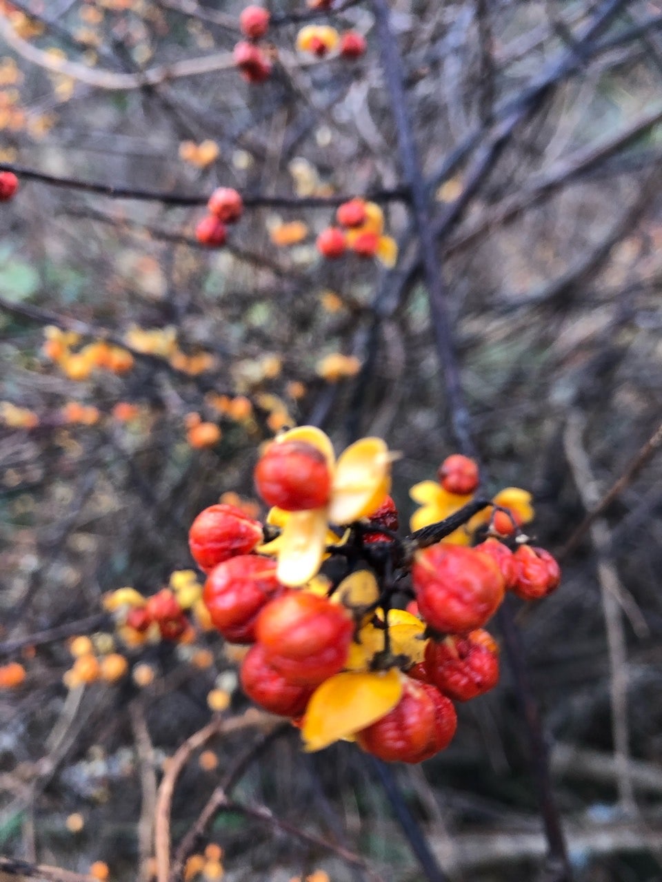 새빨간 색깔부터 주황색 빛깔까지 한덩굴이지만 저마다 다른 색빛의 열매들을 주렁주렁 매달고 있는 노박덩굴이 훤히 들여다 보이는 수풀도 겨울임을 한 눈에 보여줍니다.