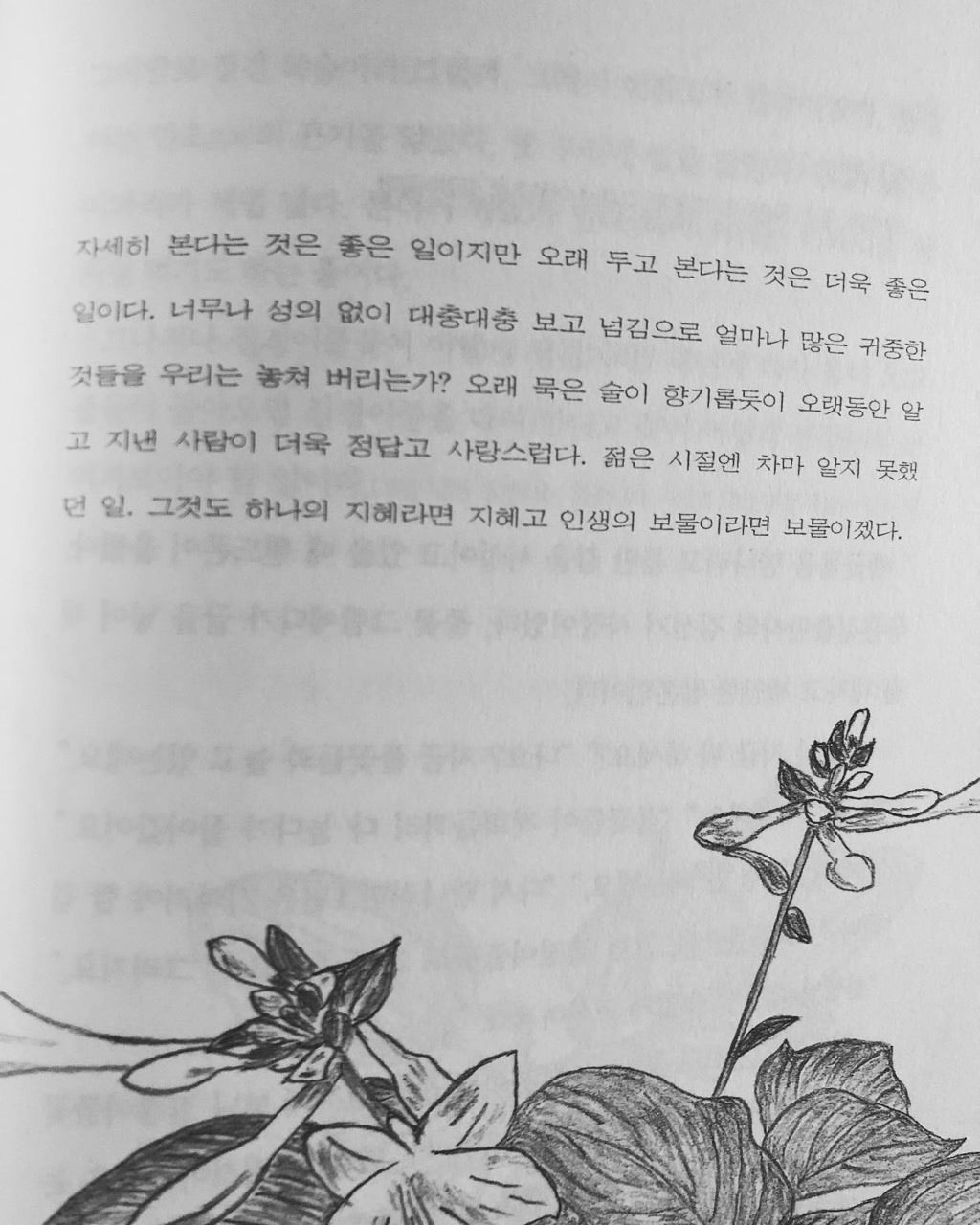 자세히 본다는 것은 좋은 일이지만 오래 두고 본다는 것은 더욱 좋은 일이다. 너무나 성의 없이 대충대충 보고 넘김으로 얼마나 많은 귀중한 것들을 우리는 놓쳐 버리는가? 오래 묵은 술이 향기롭듯이 오랫동안 알고 지낸 사람이 더욱 정답고 사랑스럽다. 젊은 시절엔 차마 알지 못했던 일. 그것도 하나의 지혜라면 지혜고 인생의 보물이라면 보물이겠다.