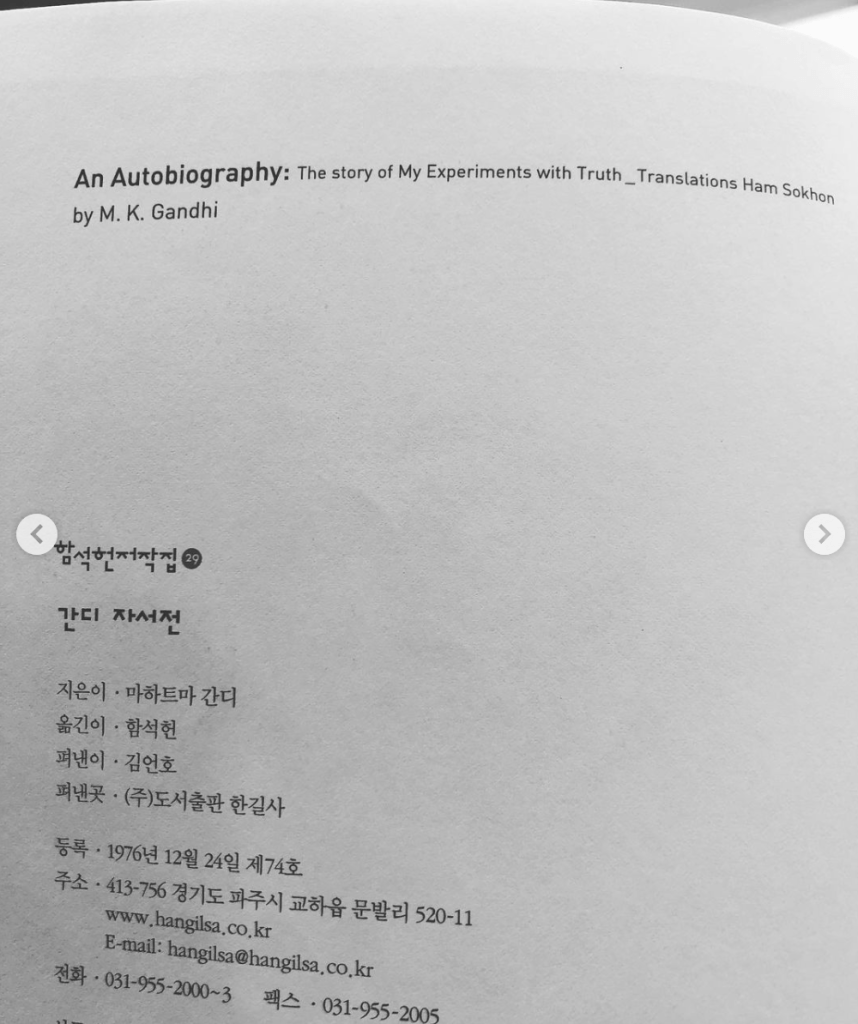 내가 뜻하는 것은 정말 자서전을 쓰려는 것이 아니다. 나는 다만 수많은 진리실험의 이야기를 해보자는 것뿐이다…내가 정말 이야기하고 싶은 것은 나만이 알 수 있는 정신적 분야에서의 나의 실험이요, 실상 내가 정치적 분야에서 활동할 수 있었던 그 힘은 여기서 얻어진 것이었다. 그리고 그 실험들이 첨으로 정신적인 것일진대 제 자랑의 여지는 있을 수가 없다. 그것은 다만 나의 겸손을 더할 뿐이다…내가 성취하려고 원하는 것, 지금껏 30년 동안 성취하려고 싸우고 애써온 것은 자아의 실현이다. 하나님의 얼굴과 얼굴을 마주 대고 봄이다. #나의진리실험이야기