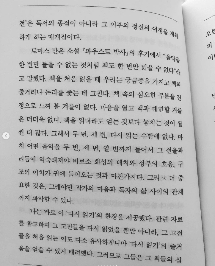 “음악을 한 번만 들을 수 없는 것처럼 책도 한 번만 읽을 수 없다.”