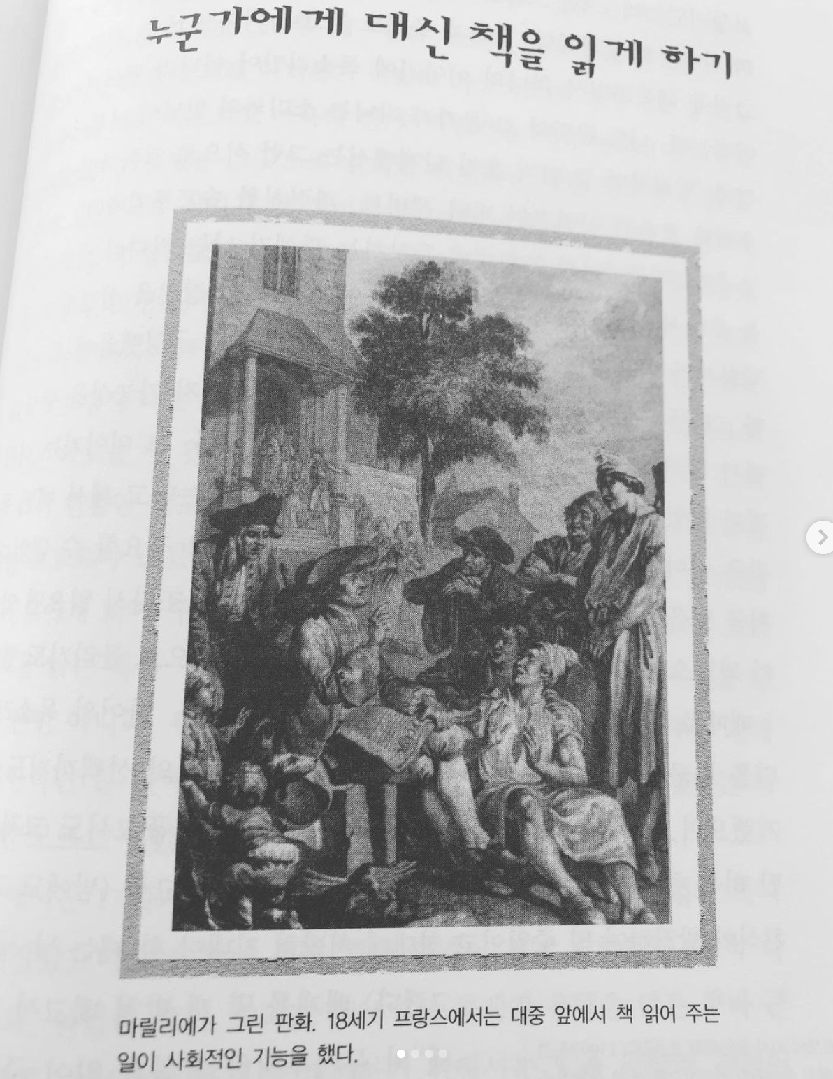 앞을 못 보는 호르헤 루이스 보르헤스가 자기 눈에 보이지 않는 책 읽어 주는 사람의 한 마디 한 마디를 더 분명하게 들으려고 눈을 지그시 감고 있다….이들 모두가 독서가다. 그들의 몸짓, 기술, 독서를 통해 얻는 기쁨과 책임감과 지식은 나의 그것과 똑같다. 그러므로 나는 외롭지 않다.