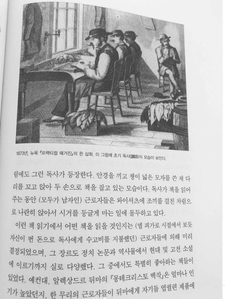 167 근로자 중에서 한 사람을 책 읽는 사람으로, 다시말해 공식적인 독사로 선택하고 다른 근로자들은 각자의 주머니를 털어 그의 노고에 대한 대가를 지불했다…이런 공동 독서가 어느 정도 성공적이었는지 매우 짧은 시간에 ‘체제 전복 행위’라는 명성을 얻었다는 사실에서도 익히 짐작할 수 있다.