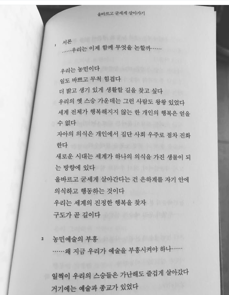 우리는 농민이다/ 일도 바쁘고 무척 힘겹다/ 더 밝고 생기 있게 생활할 길을 찾고 싶다/ 우리의 옛 스승 가운데는 그런 사람도 왕왕 있었다/ 세계 전체가 행복해지지 않는 한 개인의 행복은 얻을 수 없다…올바르고 굳세게 살아간다는 건 은하계를 자기 안에 의식하고 행동하는 것이다/ 우리는 세계의 진정한 행복을 찾자/ 구도가 곧 길이다…일찍이 우리의 스승들은 가난해도 즐겁게 살아갔다/ 거기에는 예술과 종교가 있었다/ 지금 우리에게는 그저 노동과 생존이 있을 뿐이다…예술은 지금 우리를 떠나 쓸쓸히 타락했다/ 오늘날 종교가과 예술가는 진선 혹은 미를 독점하여 팔고 있다…농민예술이란 우주 감정을 땅의 사람 개인이 구체적으로 드러낸 표현이다.