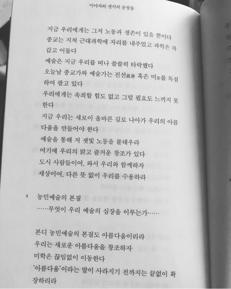 겐지는 예술이 노동하는 인간의 삶을 정서적으로 풍요롭게 만든다고 믿었습니다…이러한 신념을 담은 글이 <농민예술개론강요>입니다. 어떻게 하면 농촌 마을에 예술을 부흥시킬 수 있을까, 어떻게 하면 노동과 예술이 공존하는 삶을 살 수 있을까.