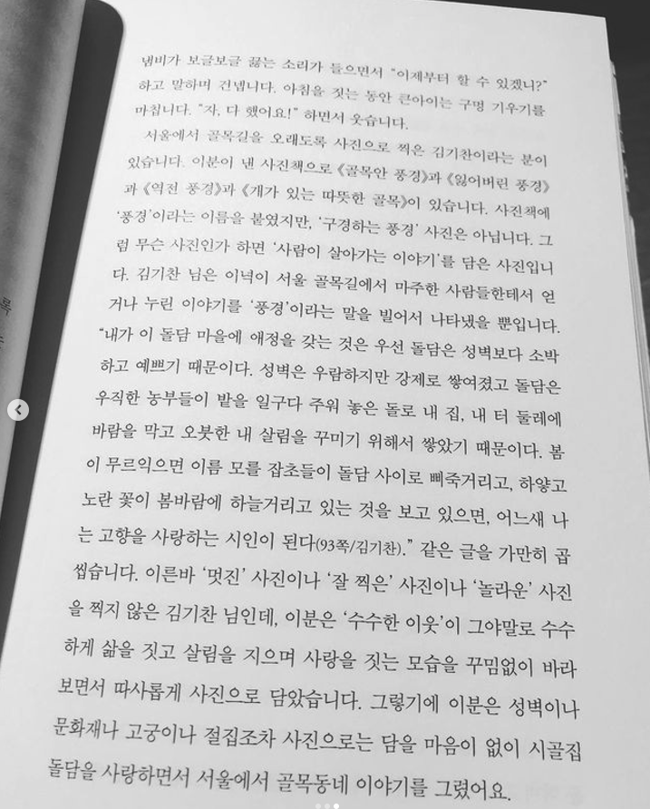 86 김기찬…이 분이 낸 사진책. <골목안 풍경> <잃어버린 풍경> <역전 풍경> <개가 있는 따뜻한 풍경>..사진책에 ‘풍경’이라는 이름을 붙였지만, ‘구경하는 사진’은 아닙니다. 그럼 무슨 사진인가 하면 ‘사람이 살아가는 이야기’를 담은 사진입니다…“내가 이 돌담 마을에 애정을 갖는 것은 우선 돌담은 성벽보다 소박하고 예쁘기 때문이다. 성벽은 우람하지만 강제로 쌓여졌고 돌담은 우직한 농부들이 밭을 일구다 주워 놓은 돌로 내 집, 내 터 둘레에 바람을 막고 오붓한 내 살림을 꾸미기 위해 쌓았기 때문이다…”…이른바 ‘멋진’ 사진이나 ‘잘 찍은’ 사진이나 ‘놀라운’ 사진을 찍지 않은 김기찬 님인데, 이분은 ‘수수한 이웃’이 그야말로 수수하게 삶을 짓고 살림을 지으며 사랑을 짓는 모습을 꾸밈없이 바라보면서 따가롭게 사진으로 담았습니다.