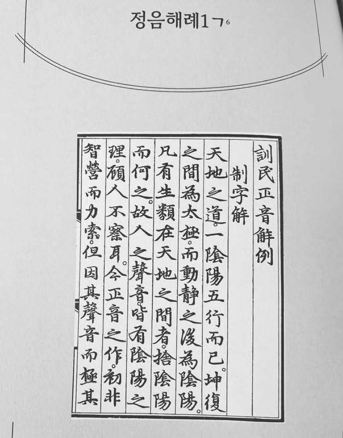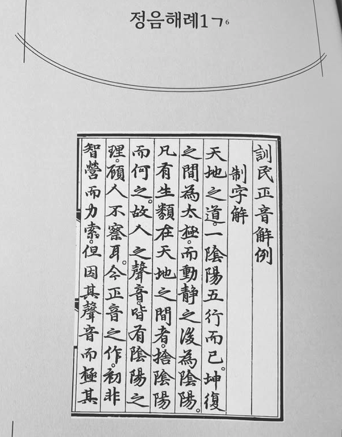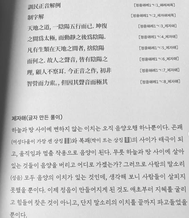 하늘과 땅 사이에 변하지 않는 이치는 오직 음양오행 하나뿐이다…무릇 하늘과 땅 사이에 살아 있는 것들이 음양을 버리고 어디로 가겠는가? 그러므로 사람의 말소리 모두 음양의 이치가 있는 것인데, 생각해 보니 사람들이 살피지 못했을 뿐이다. 이제 정음이 만들어지게 된 것도 애초부터 지혜를 굴리고 힘들여 찾은 것이 아니고, 단지 말소리의 이치를 끝까지 파고들었을 뿐이다.