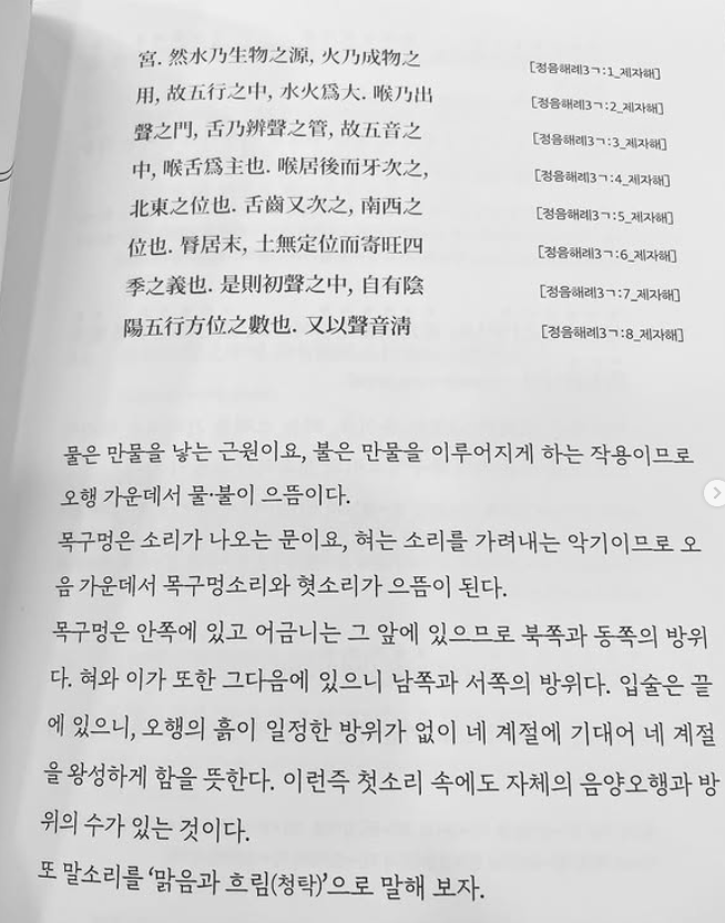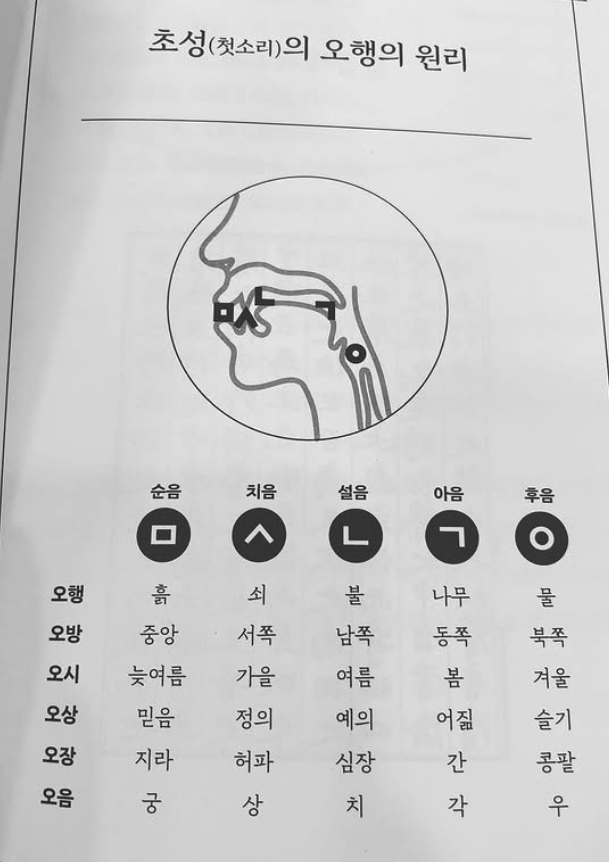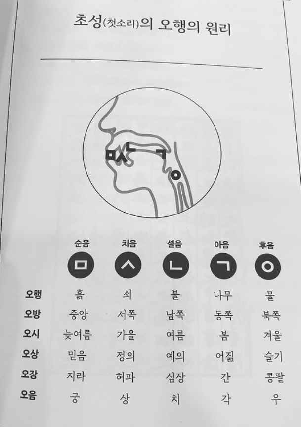 목구멍은 안쪽에 있고 어금니는 그 앞에 있으므로 북쪽과 동쪽의 방위다. 혀와 이가 그다음에 있으니 남쪽과 서쪽의 방위다. 입술은 끝에 있으니, 오행의 흙이 일정한 방위가 없이 네 계절에 기대어 네 계절을 완성하게 함을 뜻한다. 이런즉 첫소리 속에도 자체의 음양오행과 방위의 수가 있는 것이다.