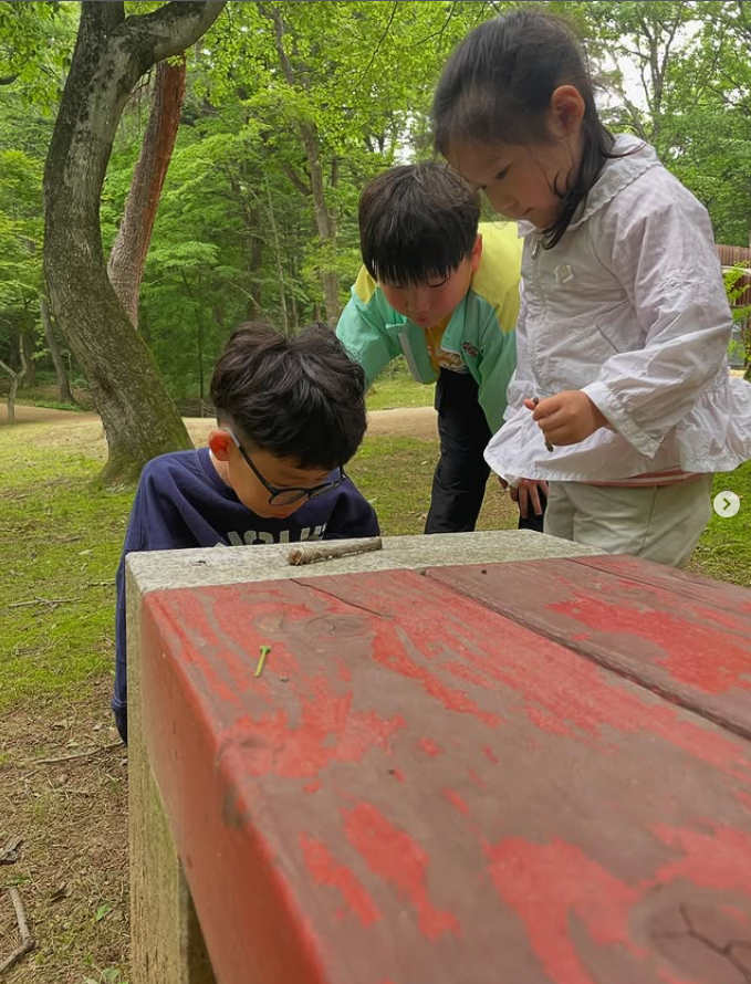 그사이 “오빠들, 여기 네 잎 클로버가 있어!” 자세히 보니 평범한 세 잎 클로버이지만, 조심조심 클로버잎을 따려다 뿌리채 뽑히자, 오빠들에게 선물로…이거 집에 가서 심으면 예쁜 꽃이 필거야,며 선듯 건내지만 오빠들 관심은 오로지 공충들…관심은 조금 다르지만 그래도 신나게 어울려 뛰어 노는 곤충탐험대 놀이를 한창 이어간다.