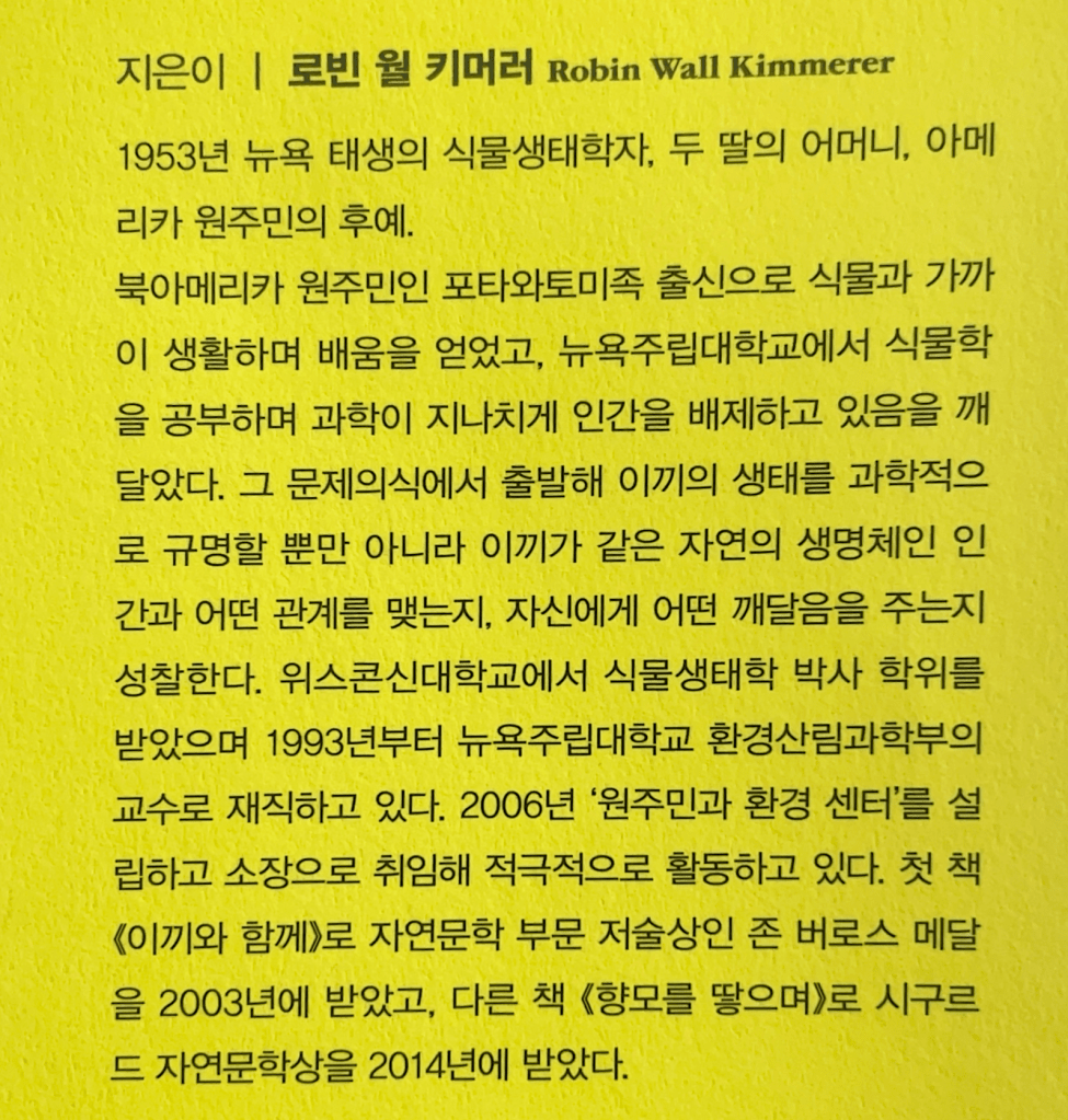 서구 전통에서는 모든 존재가 서열이 있다고 믿는다. 당연히 진화의 정점이자 창조의 총아인 인간이 꼭대기에 있고 식물은 밑바닥에 있다. 하지만 토박이 지식에서는 인간은 곧잘 ‘창조의 동생’으로 일컫는다. 우리는 말한다. 인간은 삶의 경험이 가장 적기 때문에 배울 것이 가장 많다고. 우리는 다른 종들에게서 스승을 찾아 가르침을 청해야 한다. 그들의 지혜는 살아가는 방식에서 뚜렷이 드러난다. 그들은 본보기로 우리를 가르친다. 그들은 우리보다 훨씬 오래 대지에 머물렀으며 세상을 파악할 시간이 있었다. 그들은 땅 위와 아래에서 살며 하늘세상을 대지와 연결한다. 식물은 빛과 물로 식량과 약을 만드는 법을 알며 그랗게 만든 것을 대가 없이 내어준다.