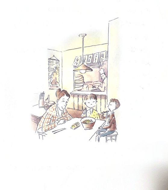 “선생님께서 ‘너는 장래 어떤 사람이 되고 싶은가’라는 제목으로 전원에게 작문을 쓰게 하셨는데, 쥰은 <우동 한 그릇>이라는 제목으로 써서 냈대요. 지금부터 그 작문 내용을 읽어드릴게요.
