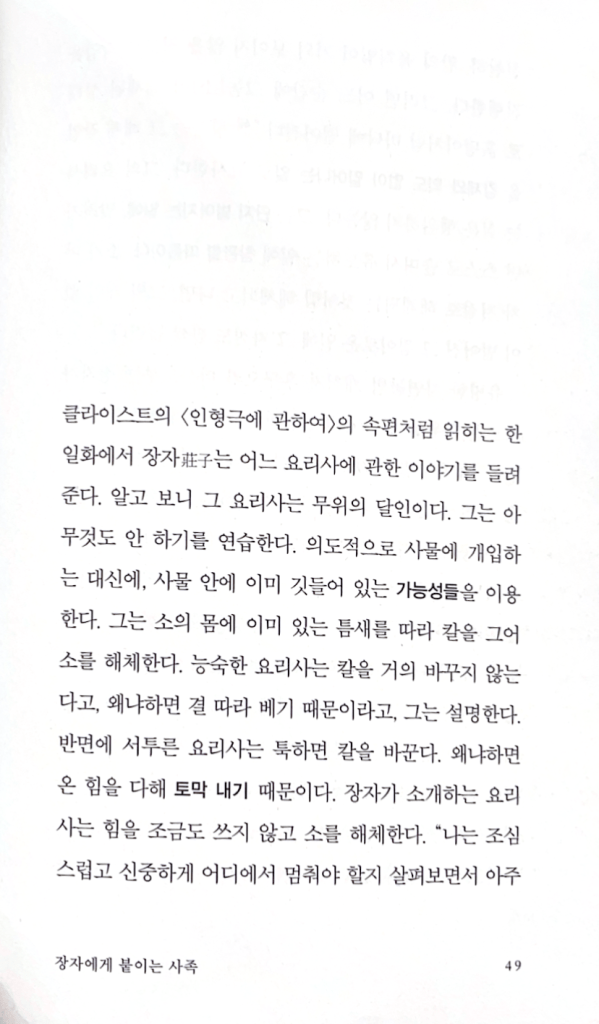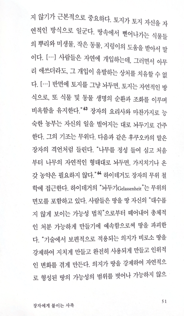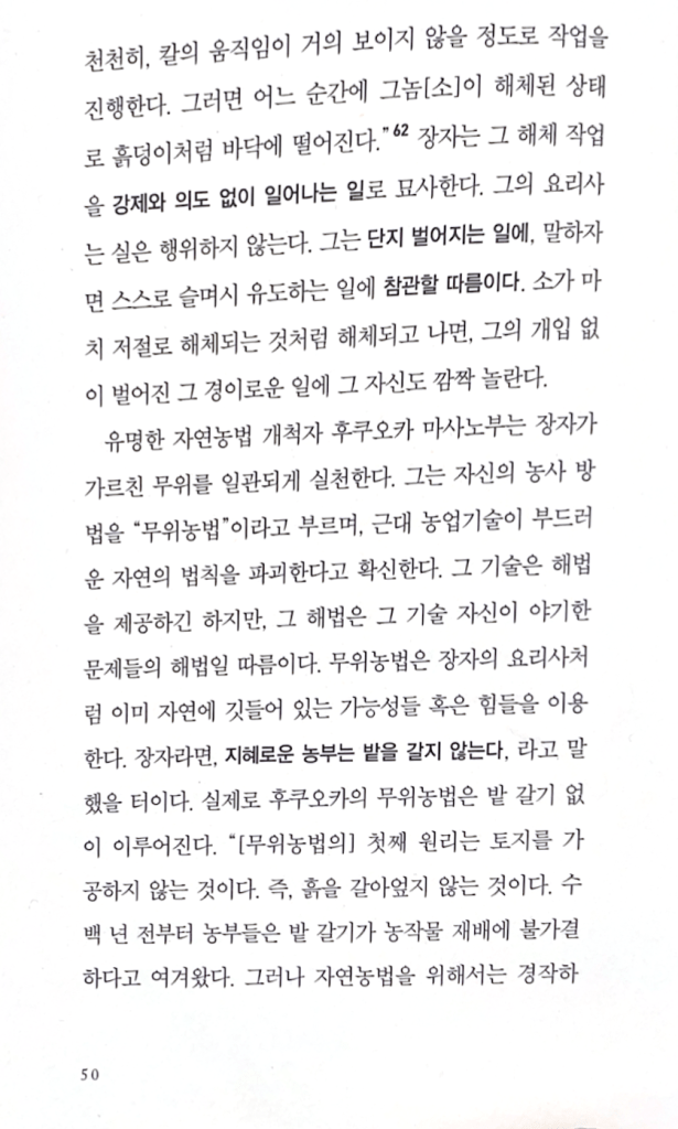유명한 자연농법 개척자 후쿠오카 마사노부는 장자가 가르친 무위를 일관되게 실천한다. 그는 자신의 농사 방법을 “무위농법”이라고 부르며, 근대 농업기술이 부드러운 자연의 법칙을 파괴한다고 확신한다. 그 기술은 해법을 제공하긴 하지만, 그 해법은 그 기술 자신이 야기한 문제들의 해법일 따름이다. 무위농법은 장자의 요리사처럼 이미 자연에 깃들어 있는 가능성들 혹은 힘들을 이용한다. 장자라면, 지혜로운 농부는 밭을 갈지 않는다, 라고 말했을 터이다. 실제로 후쿠오카의 무위농법은 밭 갈기 없이 이루어진다. “[무위농법의] 첫째 원리는 토지를 가공하지 않는 것이다. 즉, 흙을 갈아엎지 않는 것이다. 수백 년 전부터 농부들은 밭 갈기가 농작물 재배에 불가결하다고 여겨왔다. 그러나 자연농법을 위해서는 경작하지 않기가 근본적으로 중요하다. 토지가 토지 자신을 자연적인 방식으로 일군다. 땅속에서 뻗어나가는 식물들의 뿌리와 미생물, 작은 동물, 지렁이의 도움을 받아서 말이다…사람들은 자연에 개입하는데, 그러면서 아무리 애쓰더라도, 그 개입이 유발하는 상처를 치유할 수 없다…반면에 토지를 그냥 놔두면, 토지는 자연적인 방식으로, 또 식물 및 동물 생명의 순환과 조화를 이루며 비옥함을 유지한다. 장자의 요리사와 마찬가지로 능숙한 농부는 자신의 일을 벌어지는 대로 놔두기로 간주한다. 그의 기조는 무위다.