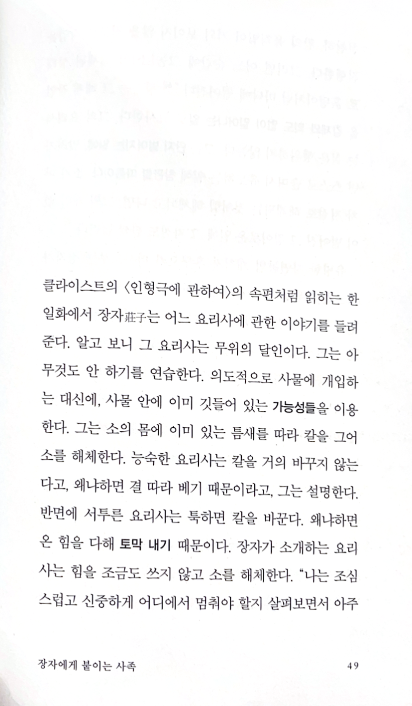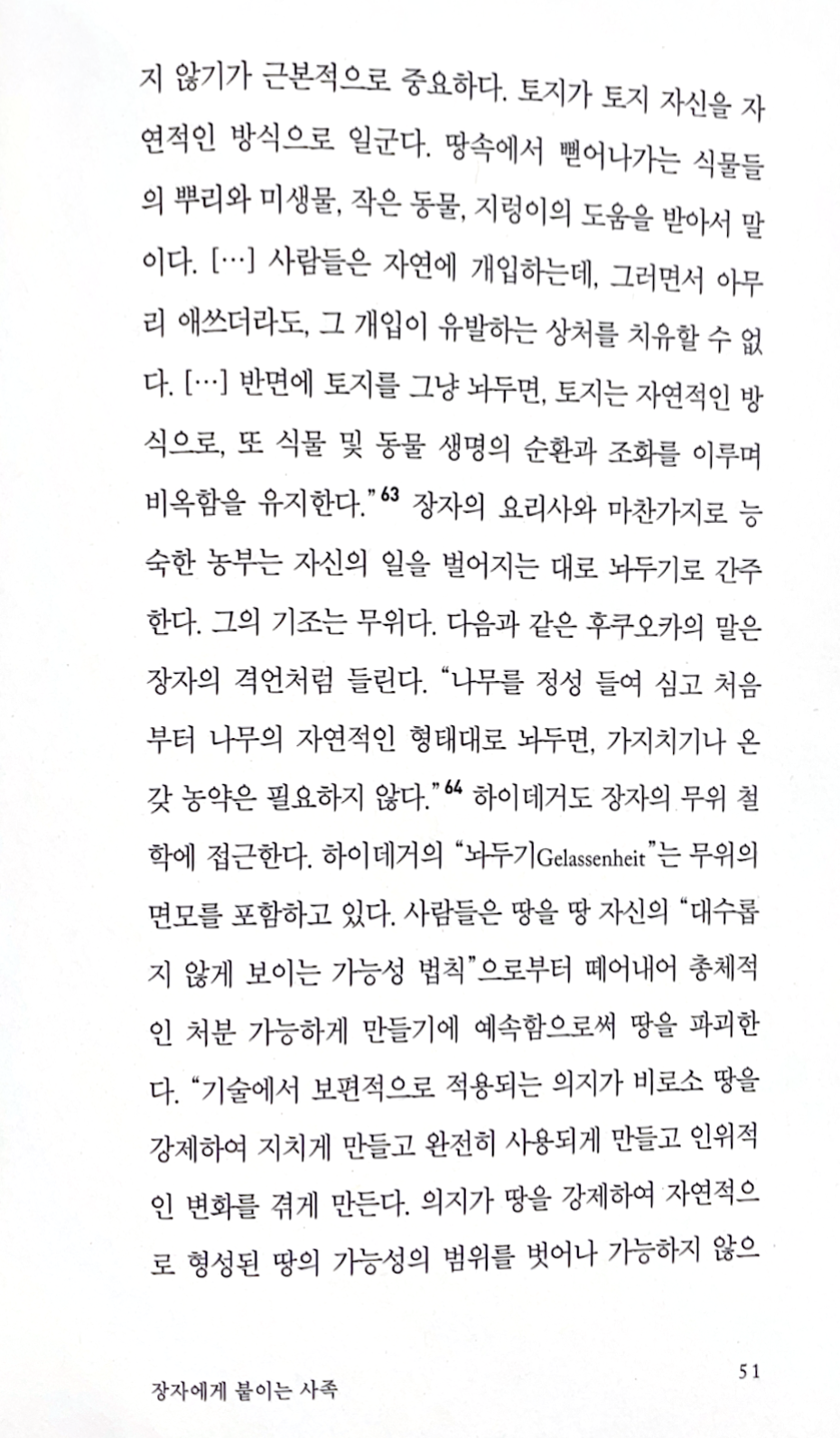 유명한 자연농법 개척자 후쿠오카 마사노부는 장자가 가르친 무위를 일관되게 실천한다. 그는 자신의 농사 방법을 “무위농법”이라고 부르며, 근대 농업기술이 부드러운 자연의 법칙을 파괴한다고 확신한다. 그 기술은 해법을 제공하긴 하지만, 그 해법은 그 기술 자신이 야기한 문제들의 해법일 따름이다. 무위농법은 장자의 요리사처럼 이미 자연에 깃들어 있는 가능성들 혹은 힘들을 이용한다. 장자라면, 지혜로운 농부는 밭을 갈지 않는다, 라고 말했을 터이다. 실제로 후쿠오카의 무위농법은 밭 갈기 없이 이루어진다. “[무위농법의] 첫째 원리는 토지를 가공하지 않는 것이다. 즉, 흙을 갈아엎지 않는 것이다. 수백 년 전부터 농부들은 밭 갈기가 농작물 재배에 불가결하다고 여겨왔다. 그러나 자연농법을 위해서는 경작하지 않기가 근본적으로 중요하다. 토지가 토지 자신을 자연적인 방식으로 일군다. 땅속에서 뻗어나가는 식물들의 뿌리와 미생물, 작은 동물, 지렁이의 도움을 받아서 말이다…사람들은 자연에 개입하는데, 그러면서 아무리 애쓰더라도, 그 개입이 유발하는 상처를 치유할 수 없다…반면에 토지를 그냥 놔두면, 토지는 자연적인 방식으로, 또 식물 및 동물 생명의 순환과 조화를 이루며 비옥함을 유지한다. 장자의 요리사와 마찬가지로 능숙한 농부는 자신의 일을 벌어지는 대로 놔두기로 간주한다. 그의 기조는 무위다.