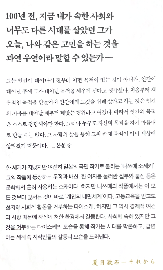 게다가 도덕적으로도 타락하고 있어. 자네는 일본의 거리에서 밝게 빛나는 순수함을 본 적이 있나? 암흑천지지. 그 안에서 내가 어떤 목소리를 내거나 일을 한다 해도 소용이 없어. 그리고 나는 원래 게으른 편이야. 자네와 가깝게 지내던 때부터 나는 게을렀어. 그때는 겉으로라도 자신만만하게 보이려고 했으니 자네에게는 내가 재능 있고 유망한 사람으로 보였을 거야. 그야 물론 지금이라고 일본이 정신적, 도적적, 구조적으로 건전해진다면 나도 예전처럼 사회에서 일을 하며 미래를 계획할 수도 있지. 정말 그런 사회가 된다면 하고 싶은 일은 많아질 테니까. 태만한 내 성격을 자극할 만한 일은 얼마든지 생길거라고 확신하네. 하지만 이 상태로는 안 돼. 지금과 같다면 나는 계속 나 자신만을 위해 살 수밖에 없어. 그래서 아까 자네가 말한 대로 내가 있는 세계를 있는 그대로 받아들여서 지내는 것에 만족하고 있네. 내 생각으로 다른 사람들을 바꾸는 것이 도저히 불가능하니까.”
